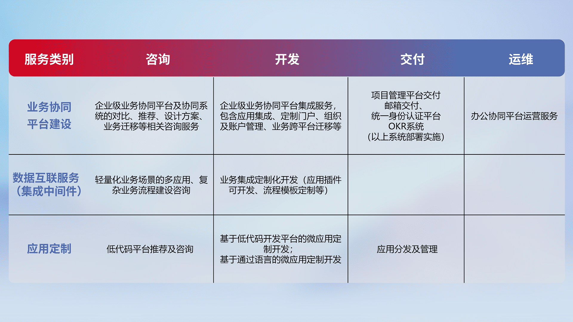 针对钉钉、、、、企微、、IDaas等平台级产品提供产品的规划、、方案、、、交付、、、定制化开发等服务,,,实现如统一协同办公、、、、智能客户服务、、、、混合会议管理、、、智能数据查询、、、等业务场景,,实现数字化转型。。。。