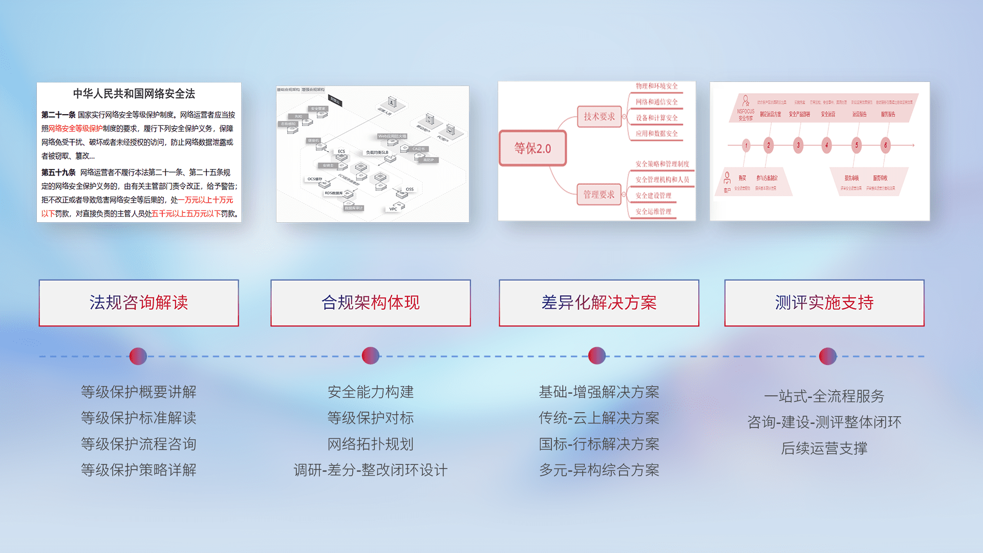 通过专业的法律咨询解读、、、、合规架构体现、、差异化解决方案、、测试实施支持等服务,,,,为客户量身打造等保合规体系。。。。